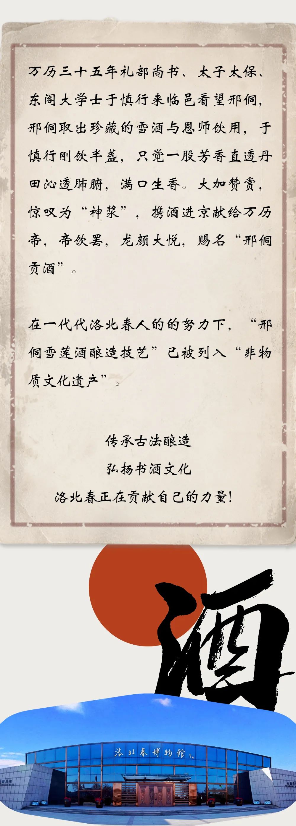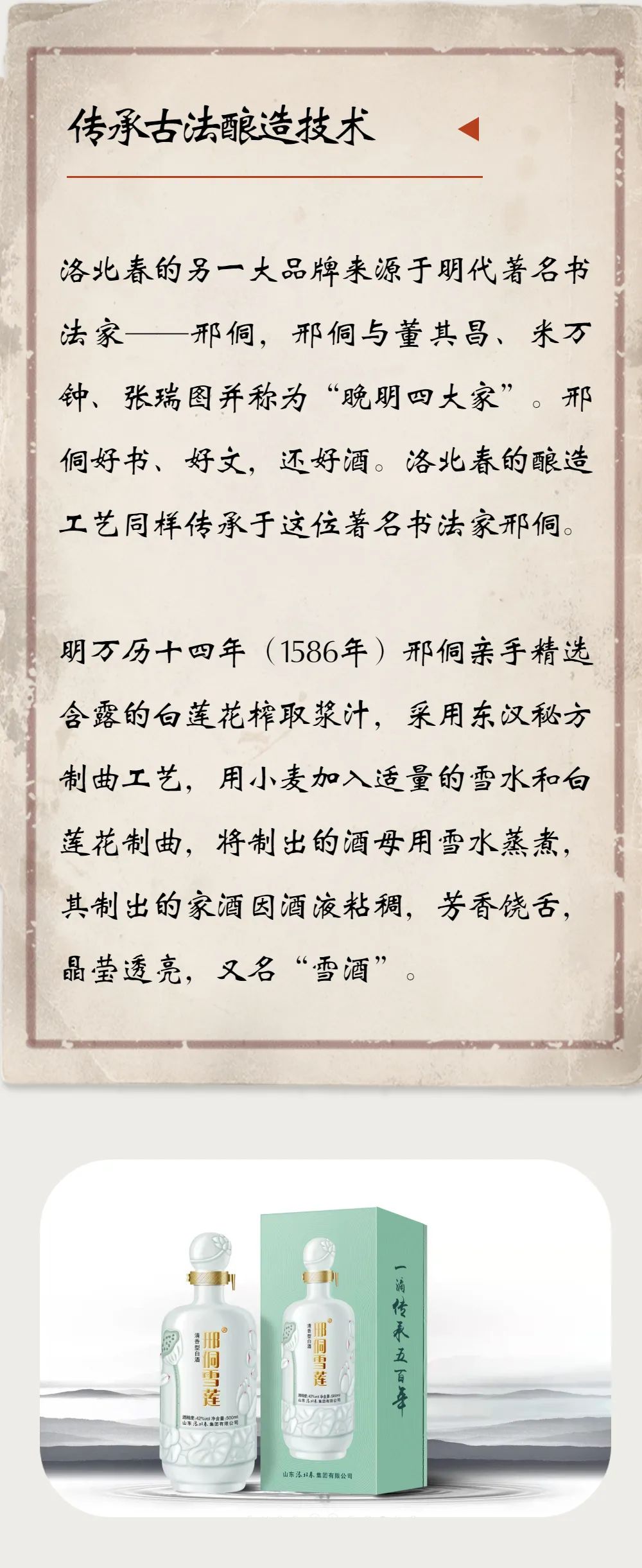 洛北春集團(tuán)始于建國(guó)前的1945年,是魯北白酒的先驅(qū),如今已成功構(gòu)建起涵蓋白酒、國(guó)際紅酒、星級(jí)酒店、金融服務(wù)及包裝印刷五大板塊的多元化產(chǎn)業(yè)格局。傳承五百年明代古法釀酒技藝,已獲“非物質(zhì)文化遺產(chǎn)”。近八十年來(lái),斬獲國(guó)內(nèi)外十大“國(guó)字號(hào)”榮譽(yù)。秉承傳統(tǒng)與創(chuàng)新相結(jié)合的發(fā)展理念,成為中華白酒文化的傳承典范。